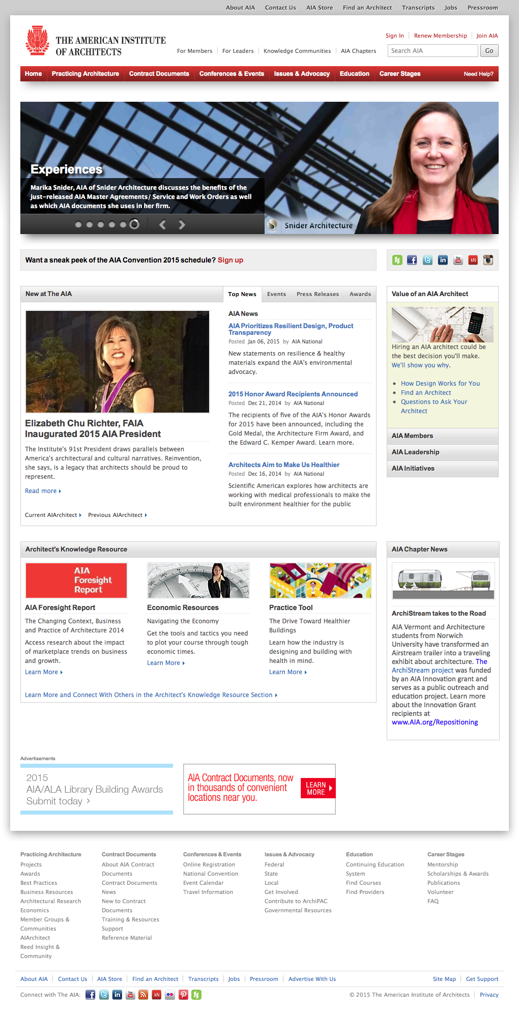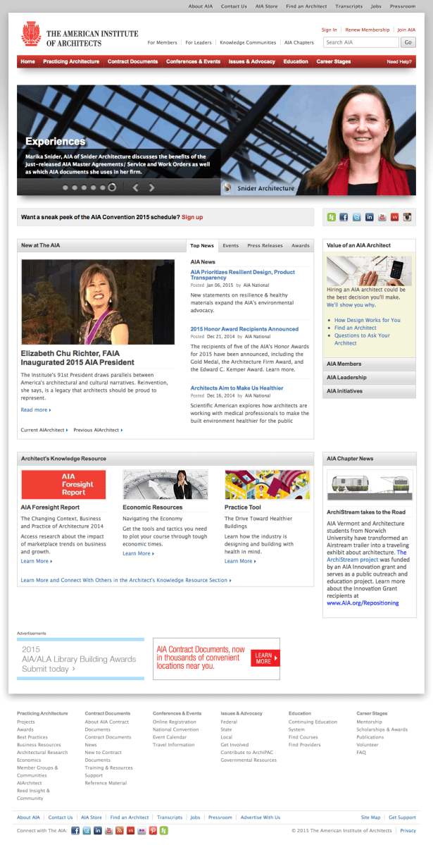 AIA Homepage Published January 7, 2015 at 1020 × 1989 in Content Design ← Previous Next → Brought about a nearly complete overhaul of this page from a content standpoint. Updated the content practices and process and established a publication schedule and workflow. Like Loading...